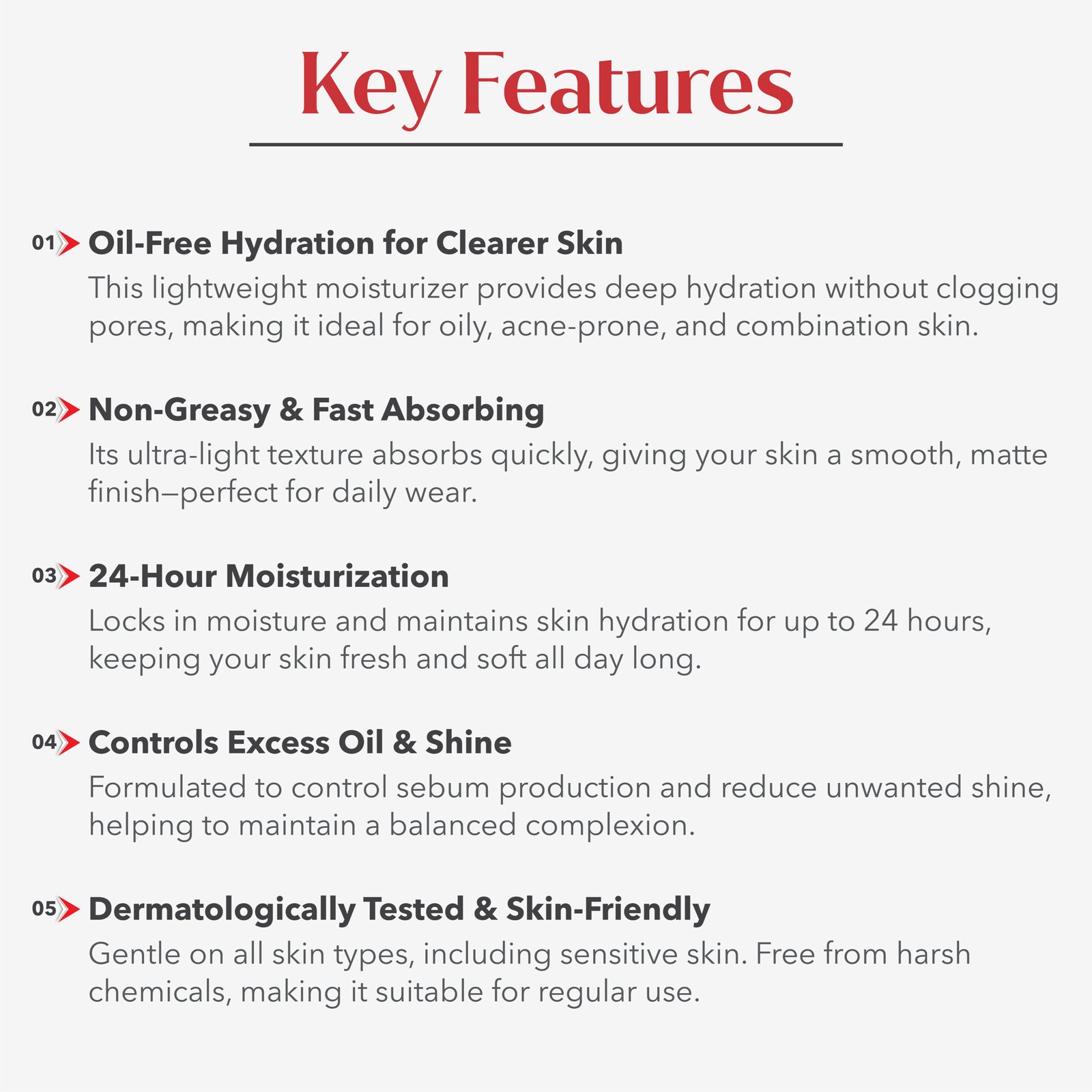 - Hydrates Without Greasiness: Lightweight, oil-free formula ideal for all skin types.