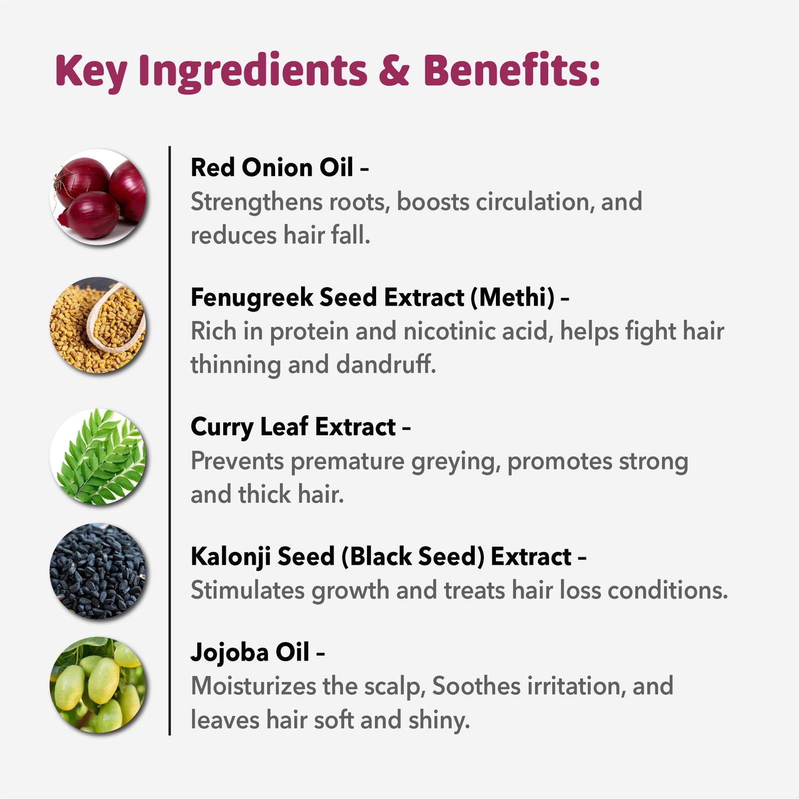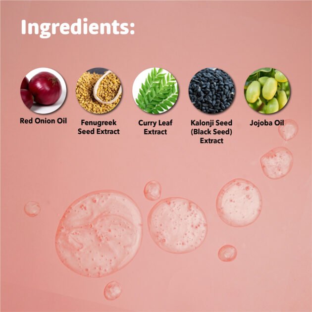 Red Onion Oil, Fenugreek Seed Extract (Methi), Curry Leaf Extract, Kalonji Seed (Black Seed) Extract, Jojoba Oil
