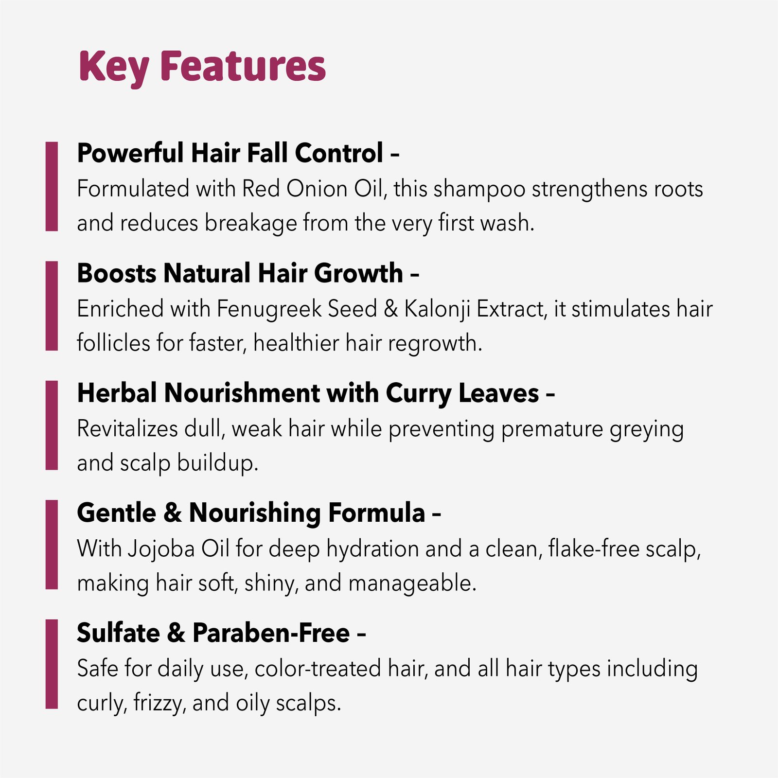Embrace stronger, healthier hair with the r’nue onion shampoo, enriched with natural red onion juice packed with sulfur, potassium, antioxidants, and plant keratin. This advanced formula gently cleanses the scalp while effectively controlling hair fall and promoting faster hair growth. The shampoo’s toxin-free, sulfate-free composition provides deep cleansing with 22% more foam and no silicones, parabens, mineral oils, or dyes, leaving hair frizz-free, silky, and nourished.