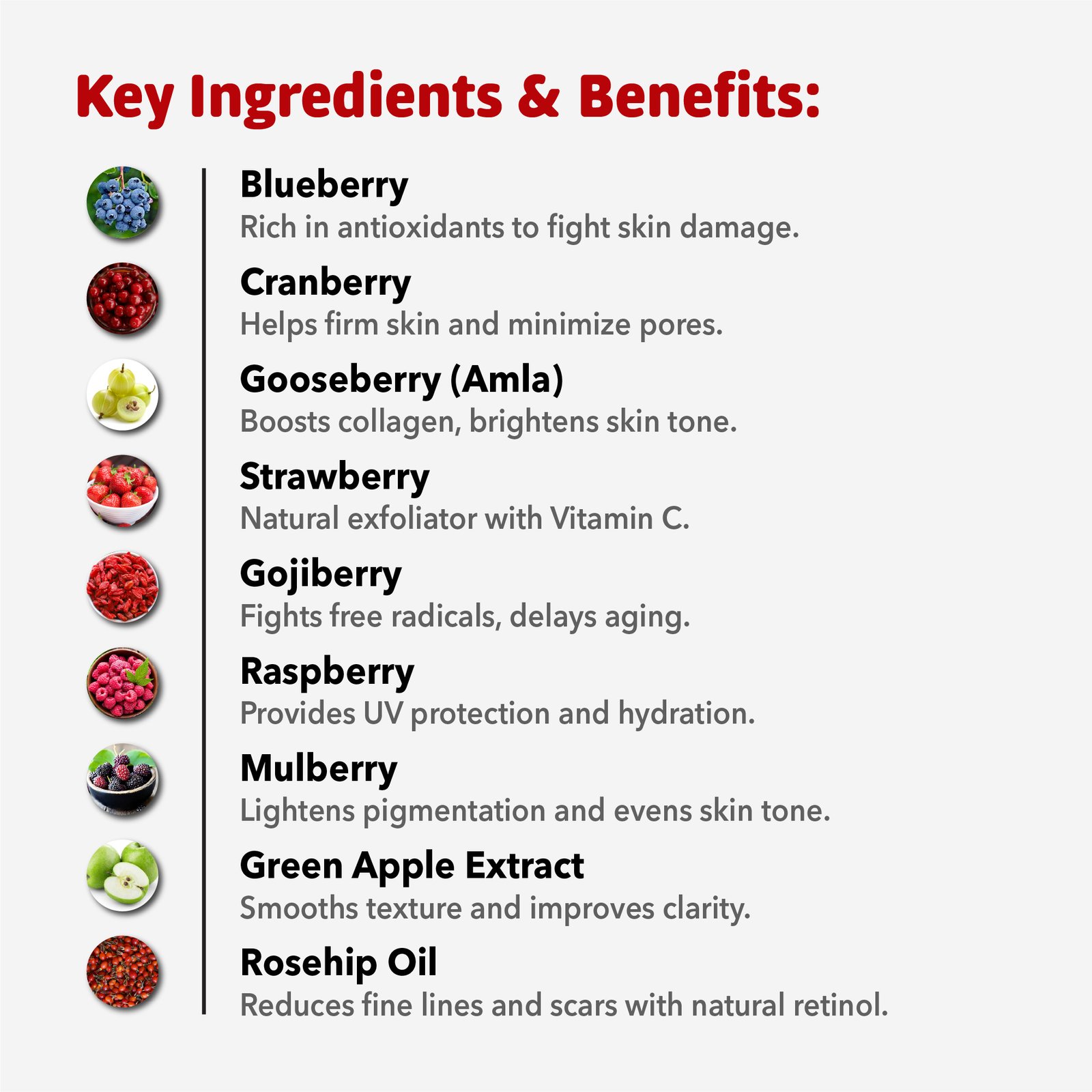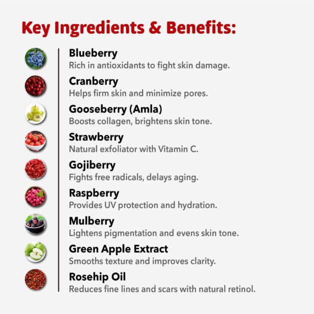 Green Apple Extract, Rosehip Oil, Blueberry, Cranberry, Gooseberry, Strawberry, Gojiberry, Raspberry, Mulberry.