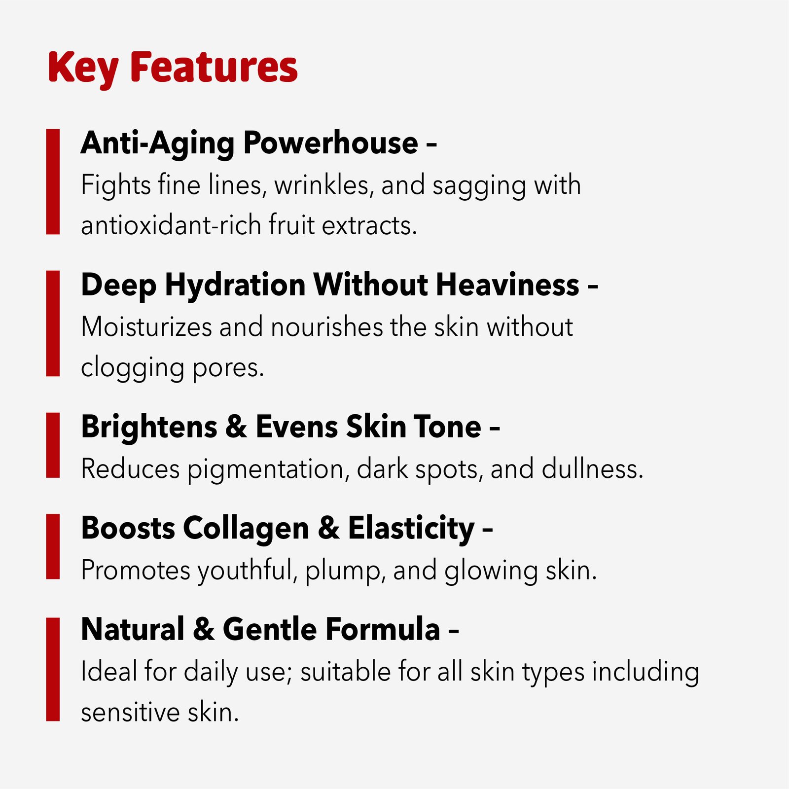- Antioxidant-Rich Formula: Protects against environmental stress and aging.